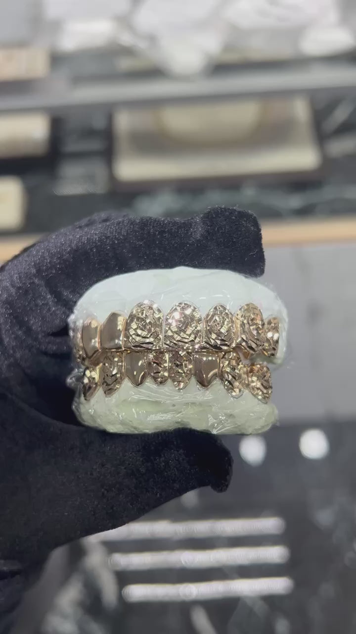 Bring elegance and edge to your smile with our Circle/Rose Cuts Solid Custom Grillz. This grill is a perfect blend of refined design and bold craftsmanship, crafted from solid 10K, 14K, or 18K gold in your choice of yellow, white, or rose gold. Featuring intricate circle and rose cuts, these grillz offer a stunning visual effect that captures light and reflects it with every movement, creating a dynamic, multi-dimensional shine.