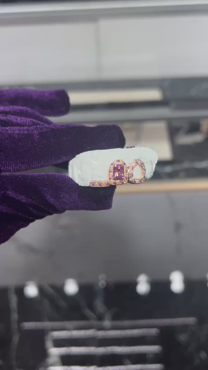 Bold. Brilliant. Unmistakably you. The Custom 2 Piece Gemstone Grillz with Diamonds + Trim is designed to elevate your smile with elegance and edge.