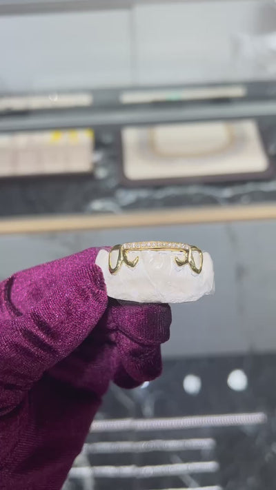 Make your smile unforgettable with our Custom Diamond Bar Grillz with Special Design — a unique blend of artistry and luxury. Featuring a row of hand-set natural diamonds, the sleek diamond bar design is elevated with a special custom design that adds a personal, one-of-a-kind touch. This grill is fully tailored to your exact specifications, ensuring a flawless fit and maximum comfort.