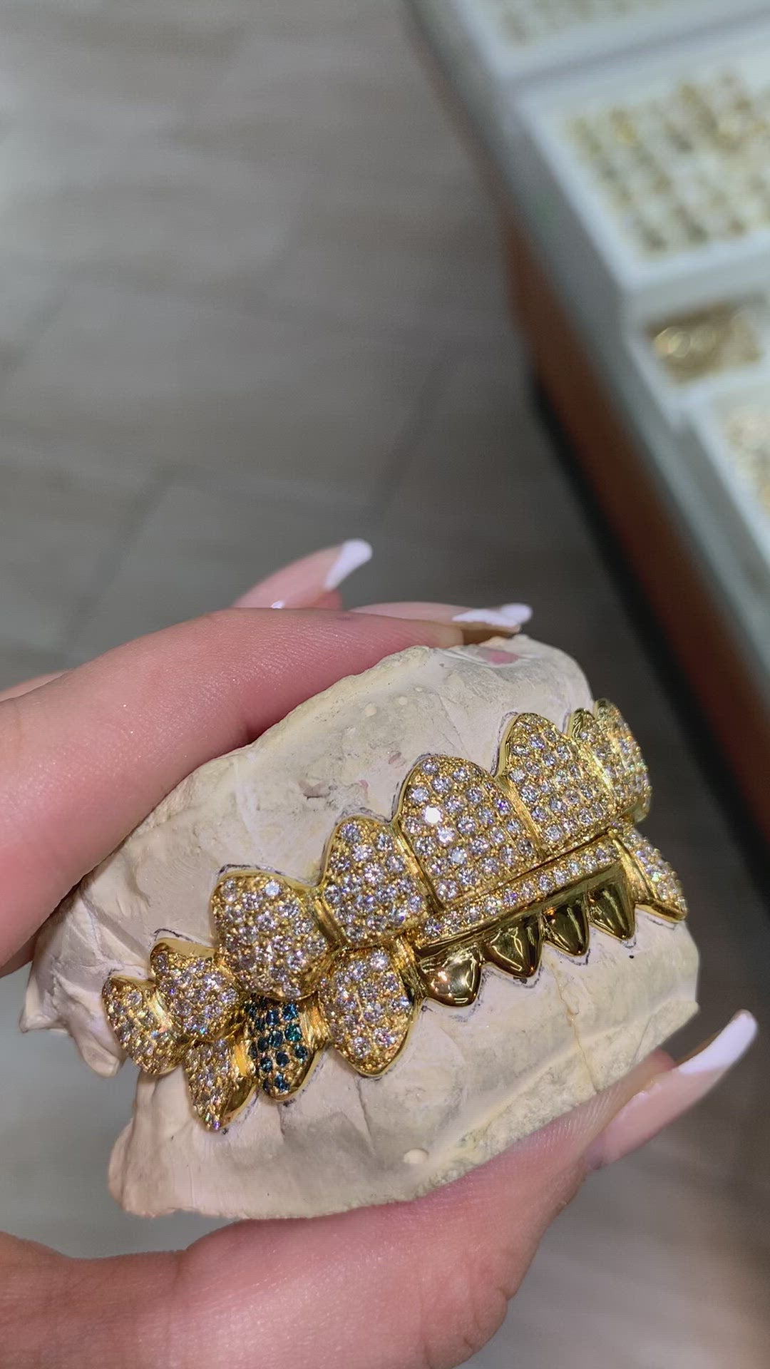The straight setting provides a flawless, symmetrical finish, while the blue diamond fangs add an element of fierceness, giving your smile a rare touch of color and elegance. Whether youโre stepping onto the red carpet or hitting the streets, this grill is made to turn heads and hold attention.